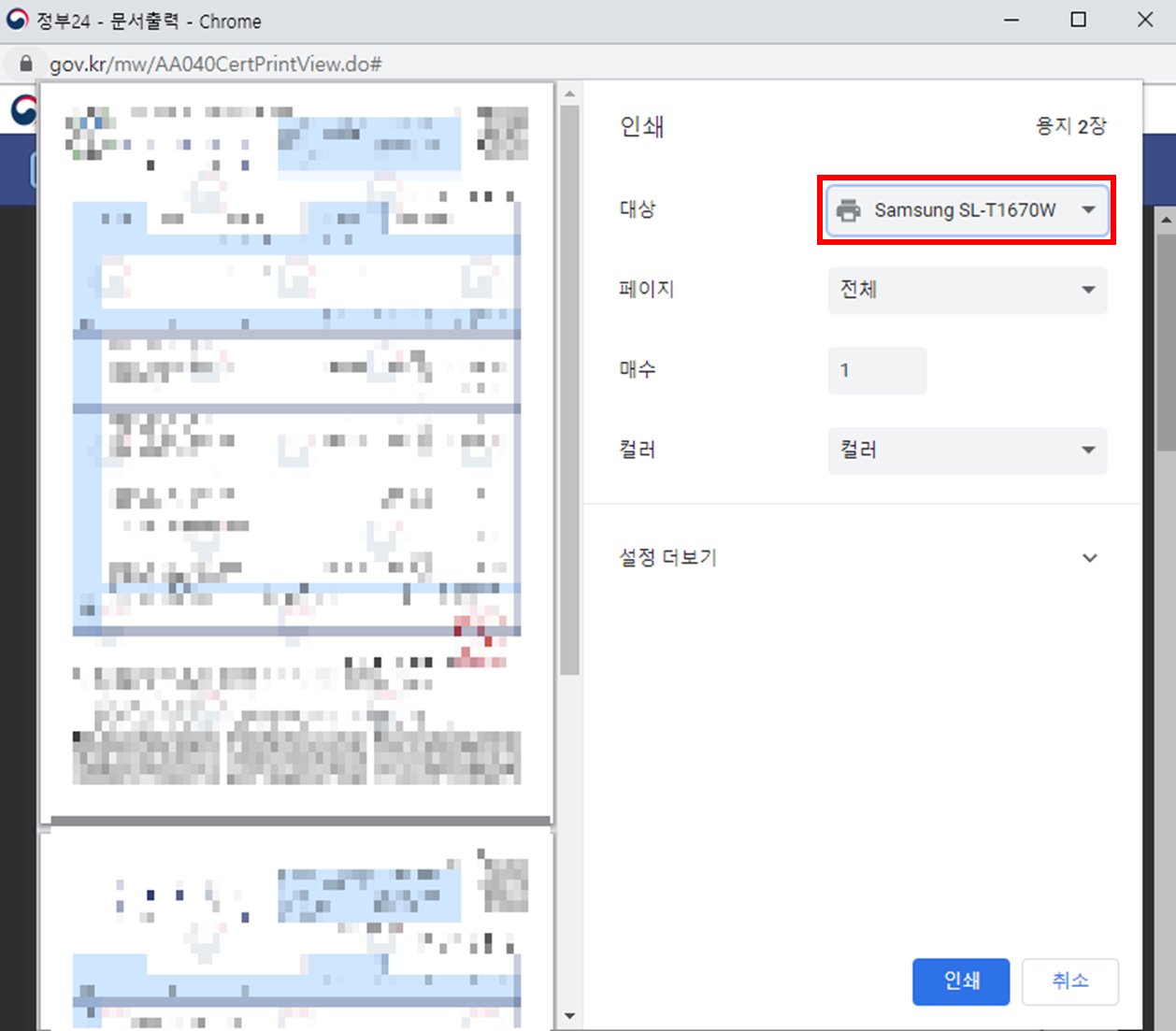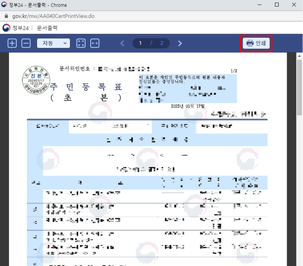 그 다음 아래와 같이 인쇄 버튼을 눌러줍니다.