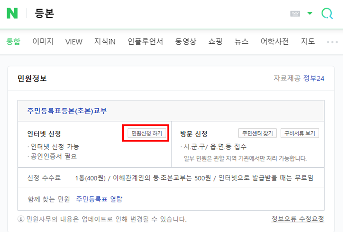먼저 네이버에 등본이라고치면 아래와 같이 나오는데요.
