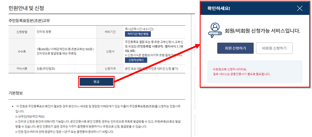 그러면 저렇게 회원/비회원 신청이 뜨는데 어차피 등/초본 신청 한두번 하실거도 아닌데 회원가입 하실걸 추천드립니다.!