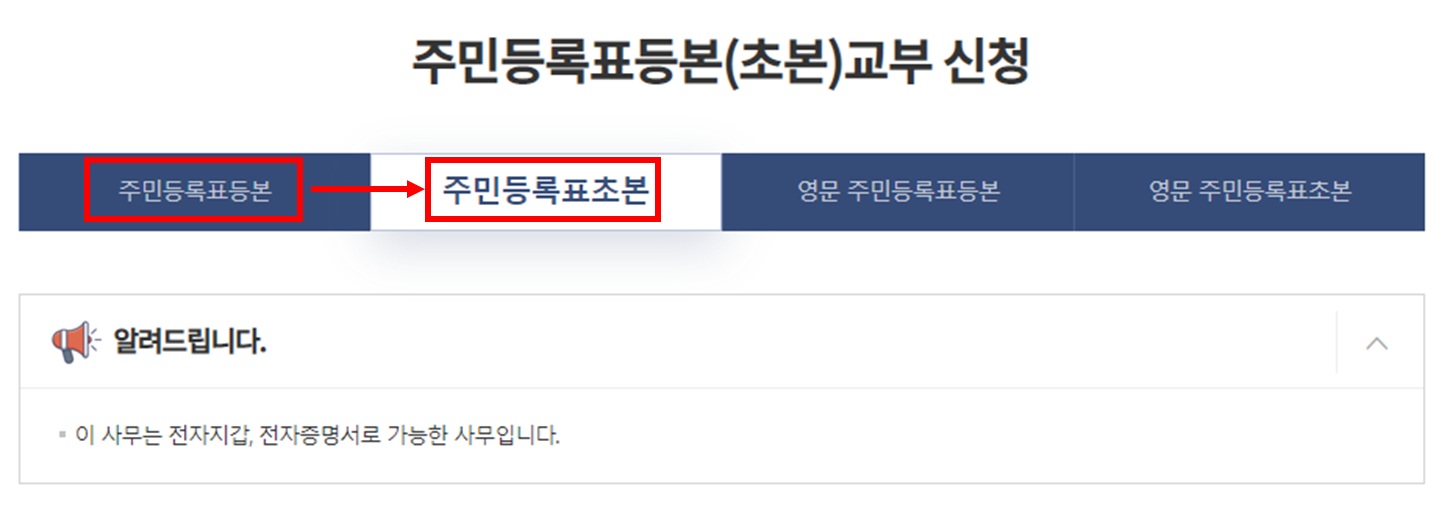 그리고 교부신청에서 아래와 같이 등본에서 초본으로 클릭해주면 초본 신청하는 화면으로 변경됩니다.