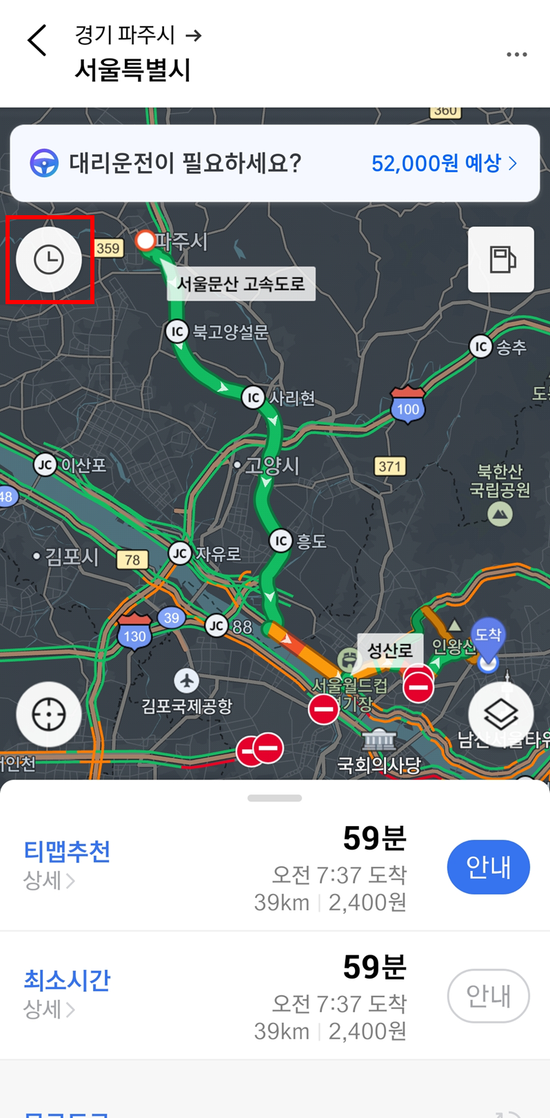 가고싶은곳을 검색한 뒤 좌측 상단에 시계모양을 눌러줍니다.