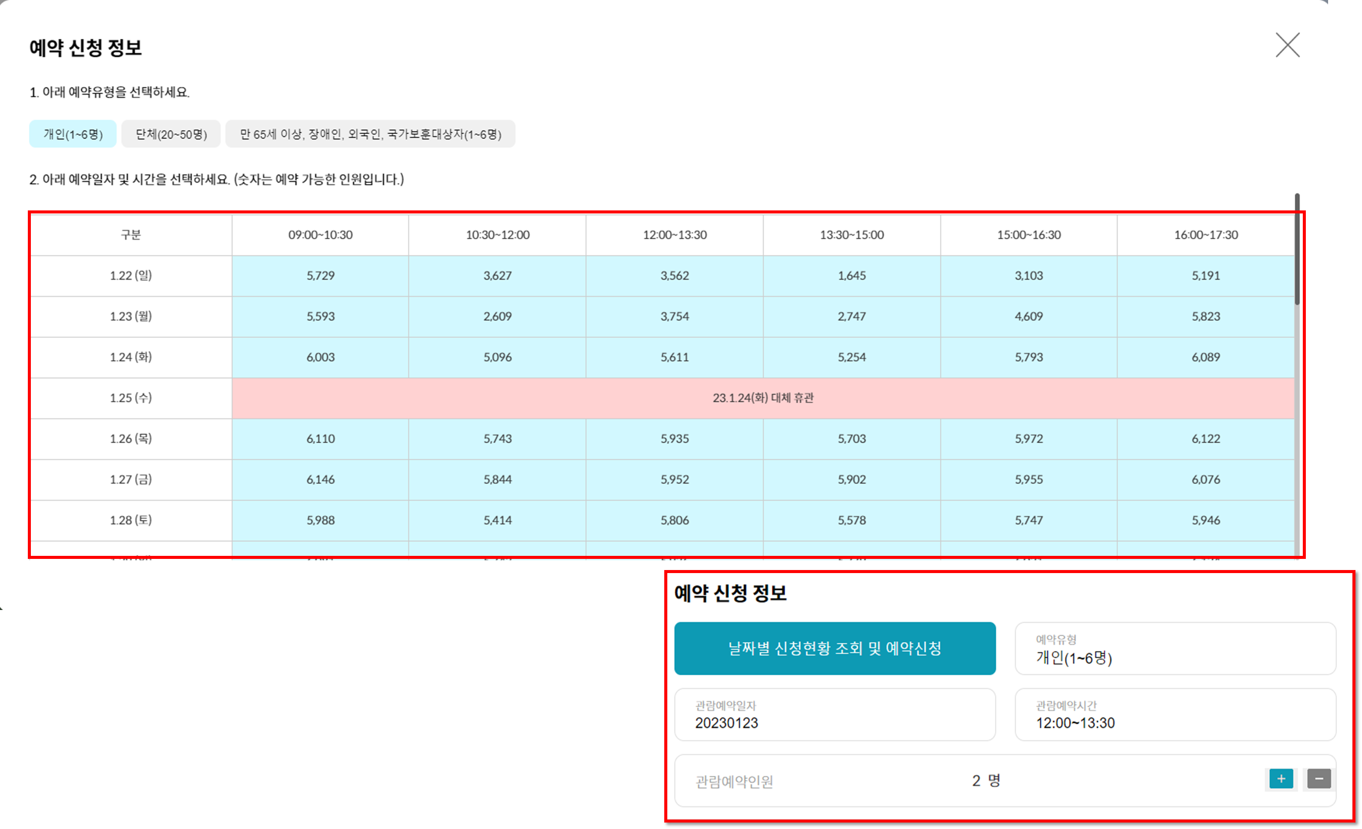 "날짜별 신청현황 조회 및 예약신청" 버튼을 눌렀다면 아래 화면이 뜨는데요.