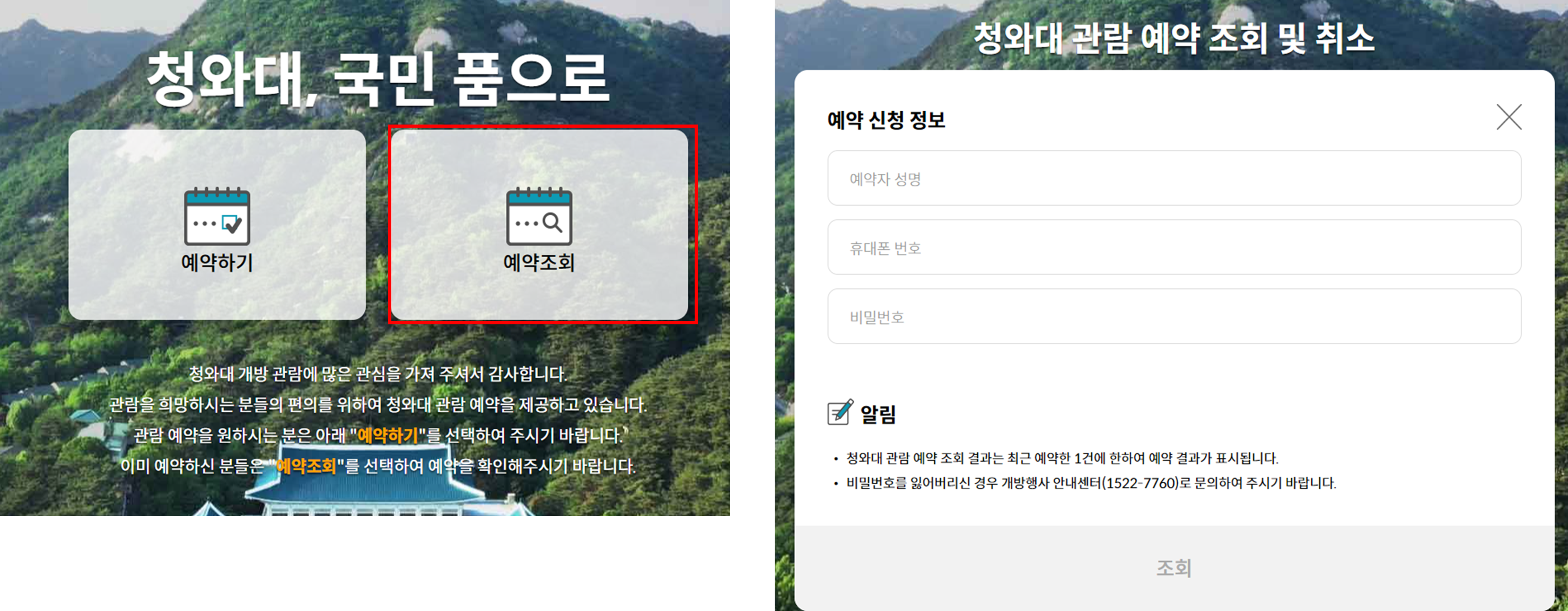 먼저 사이트 메인에서 예약조회를 누른 후 예약자 성명, 휴대폰번호, 비밀번호를 누르고 조회를 합니다.