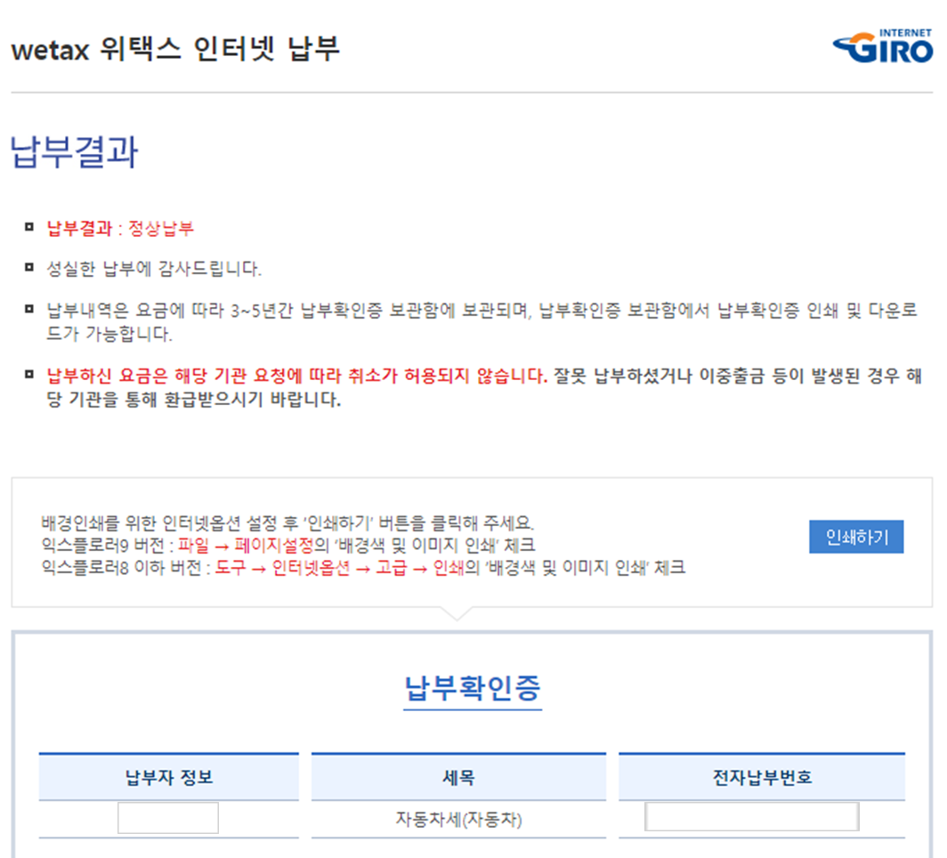 간편결재를 하고 나니 정상납부라고 뜨면서 납부 확인증이 나오네요.