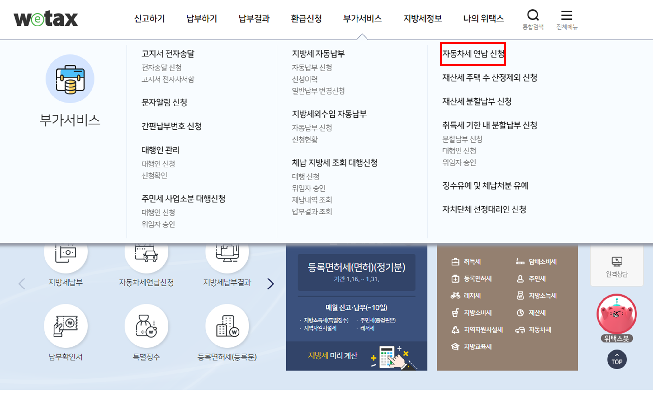 그러면 아래와 같이 뜨는데 부가서비스 - 자동차세 연납신청으로 들어가줍니다.