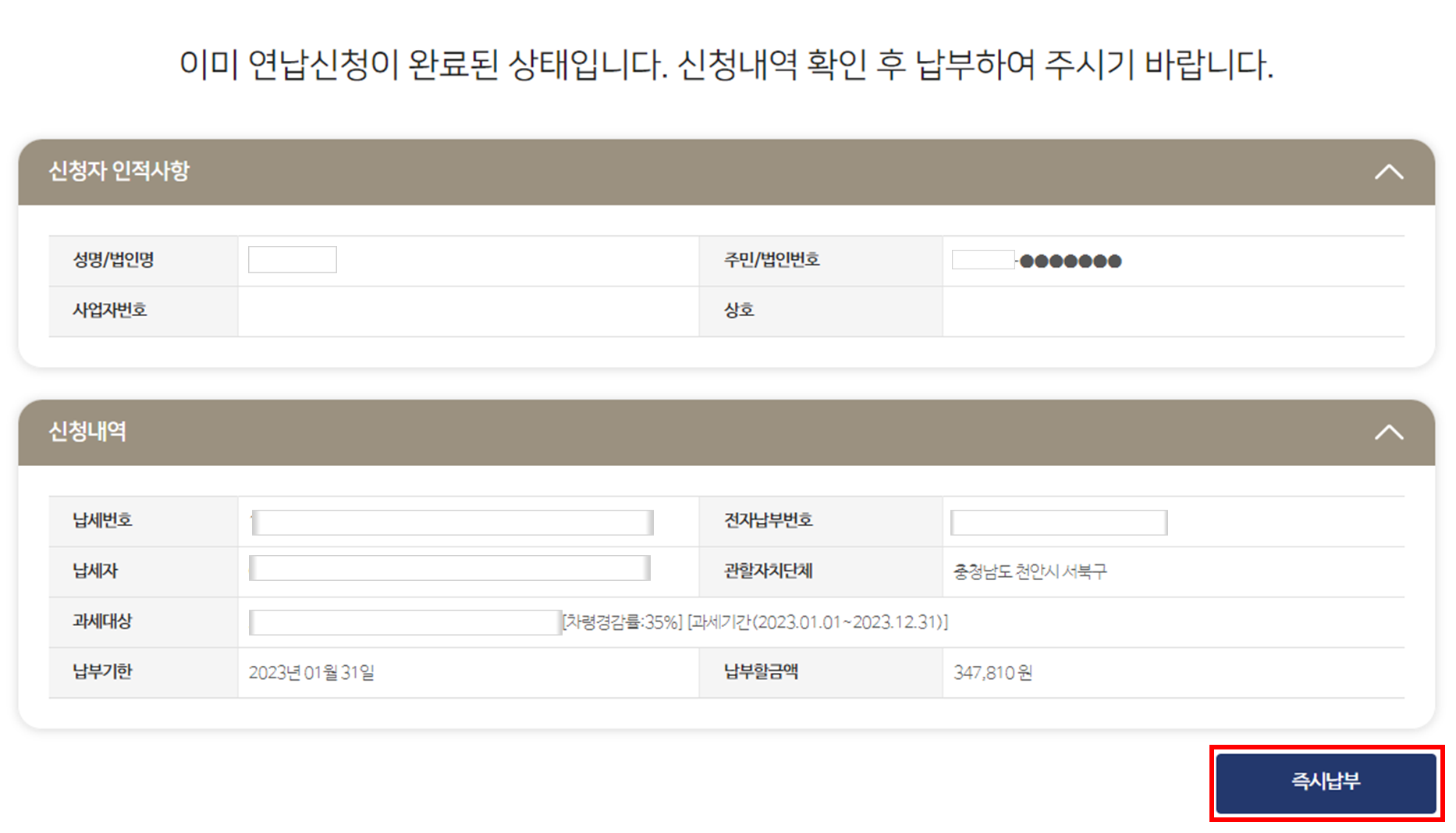 저는 이미 연납 신청이 되어 있어서 이렇게 뜨는데요.