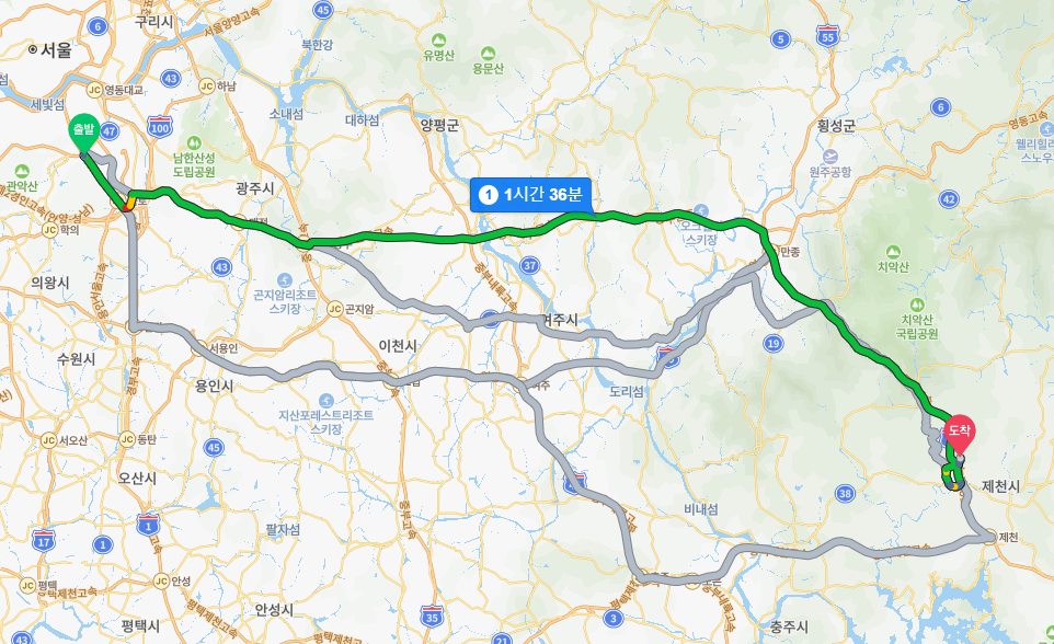 서울 만남의 광장에서 캠핑장까지 1시간 36분 걸리네요.