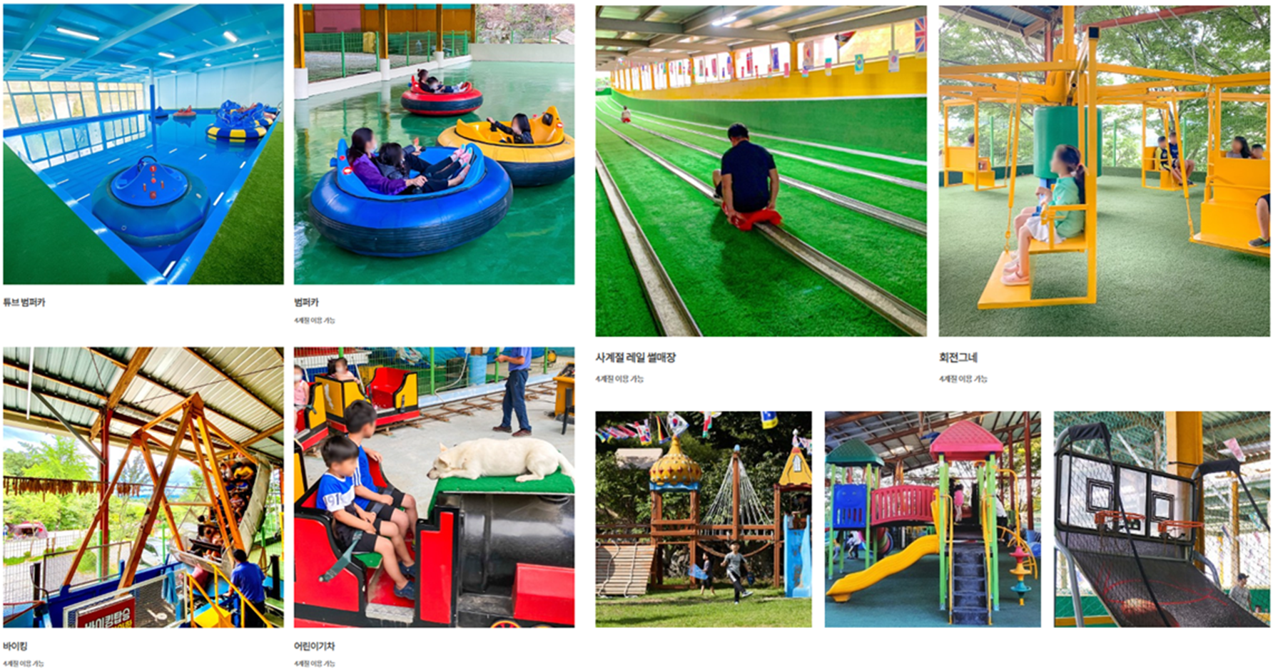 튜브 범퍼카, 범퍼카, 바이킹, 미니기차, 레일썰매, 회전그네, 놀이터, 에어바운스 등이 있습니다.