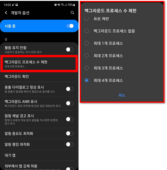 백그라운드 수를 제한해줍니다. 저는 3 또는 4개정도 켜줍니다.
