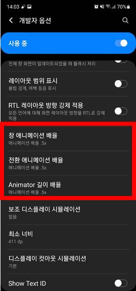 개발자 모드가 켜진것 확인 후 아래로 내리다보면 애니메이션 배율이 있습니다.