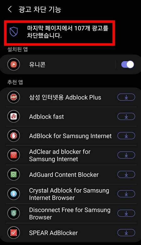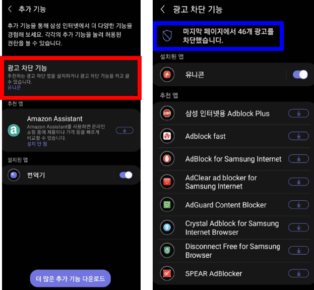 '삼성브라우저 설정 → 추가기능 → 광고차단기능' 이렇게 들어가면 됩니다.