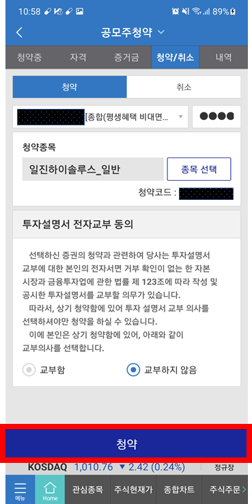 청약을 누르면 투자 설명서 교부 체크 및 비밀번호 입력 후 청약을 누릅니다.