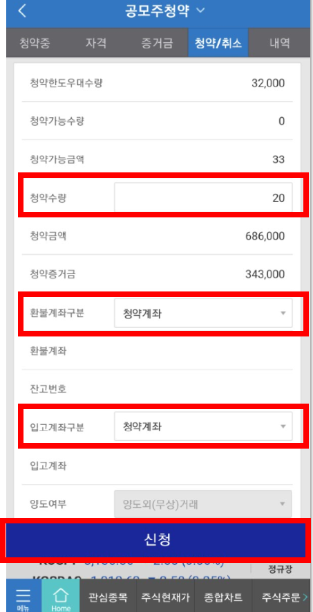 청약을 누르면 아래와 같이 청약수량, 환불계좌, 입고계좌를 선택할 수 있는데요.