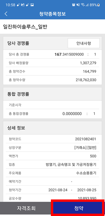 그러면 일진하이솔루스 관련 정보가 나오는데 청약을 누릅니다.