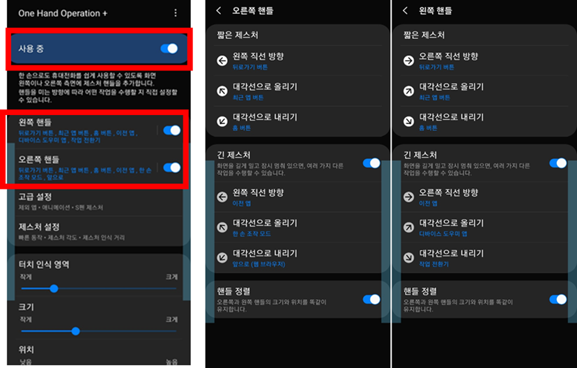 먼저 오른/왼쪽 스와이프 방향 및 길게, 짧게에 따라 동작을 어떻게 할지 설정할 수 있습니다.