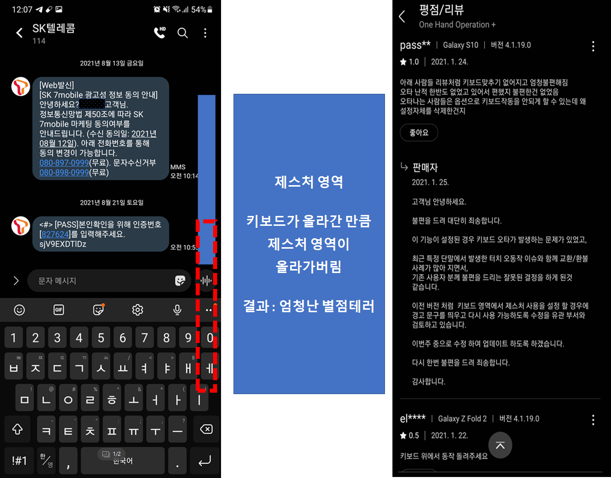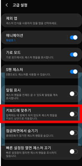 키보드가 올라간만큼 제스처 영역이 올라가서 동작을 하려면 위로 손가락이 그만큼 올라가야 했던건데요.