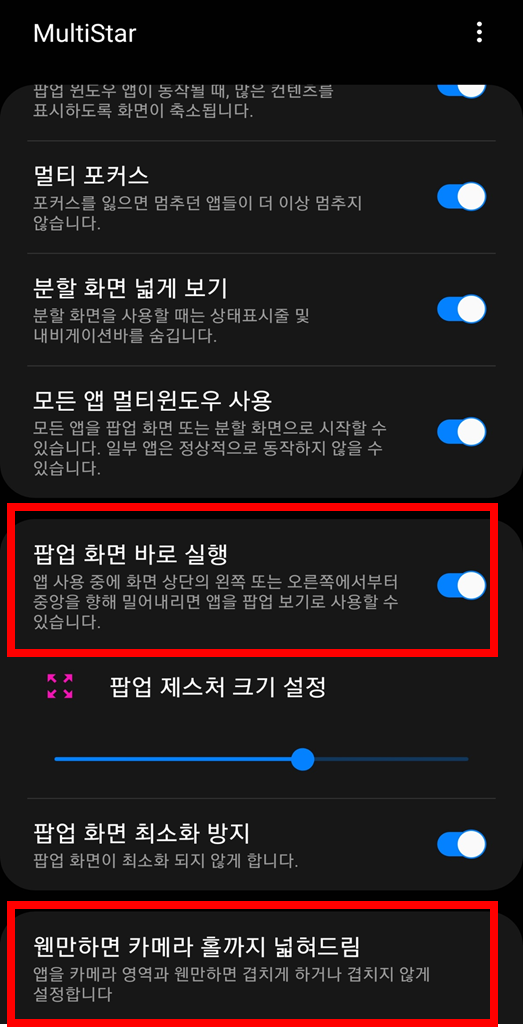 제가 더 설정하는 것은 팝업 바로실행과 웬만하면 카메라 홀까지 넓혀드림입니다.