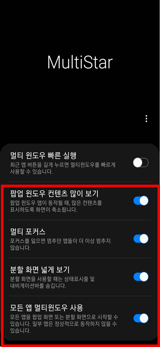 팝업 윈도우 많이 보기, 멀티 포커스, 분할화면 넓게보기, 모든앱 멀티 윈도우 사용 입니다.