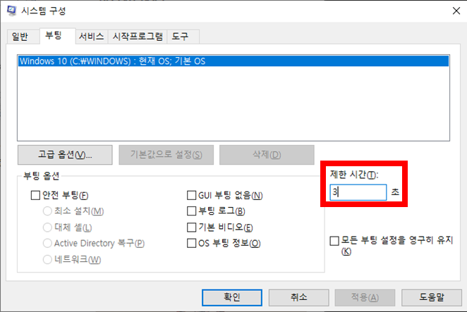 멀티 부팅일시 기본 : 30초에서 3초로 변경하면 부팅 속도가 빨라집니다.