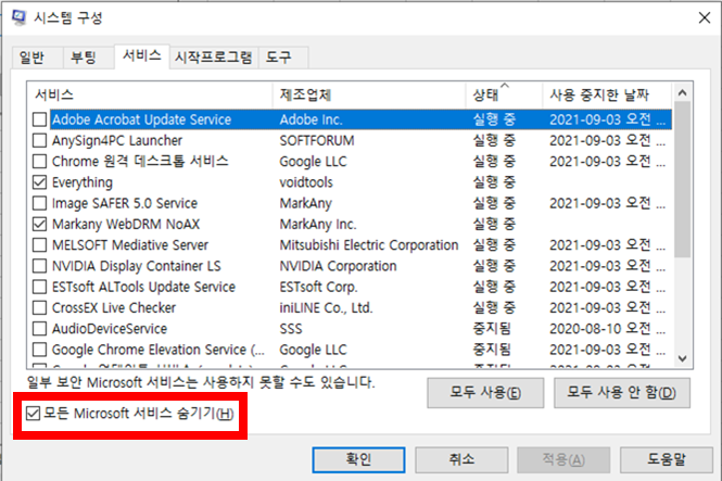 서비스탭으로 넘어가면 현재 실행중인 프로그램과 사용하지않는 프로그램이 있는데요.