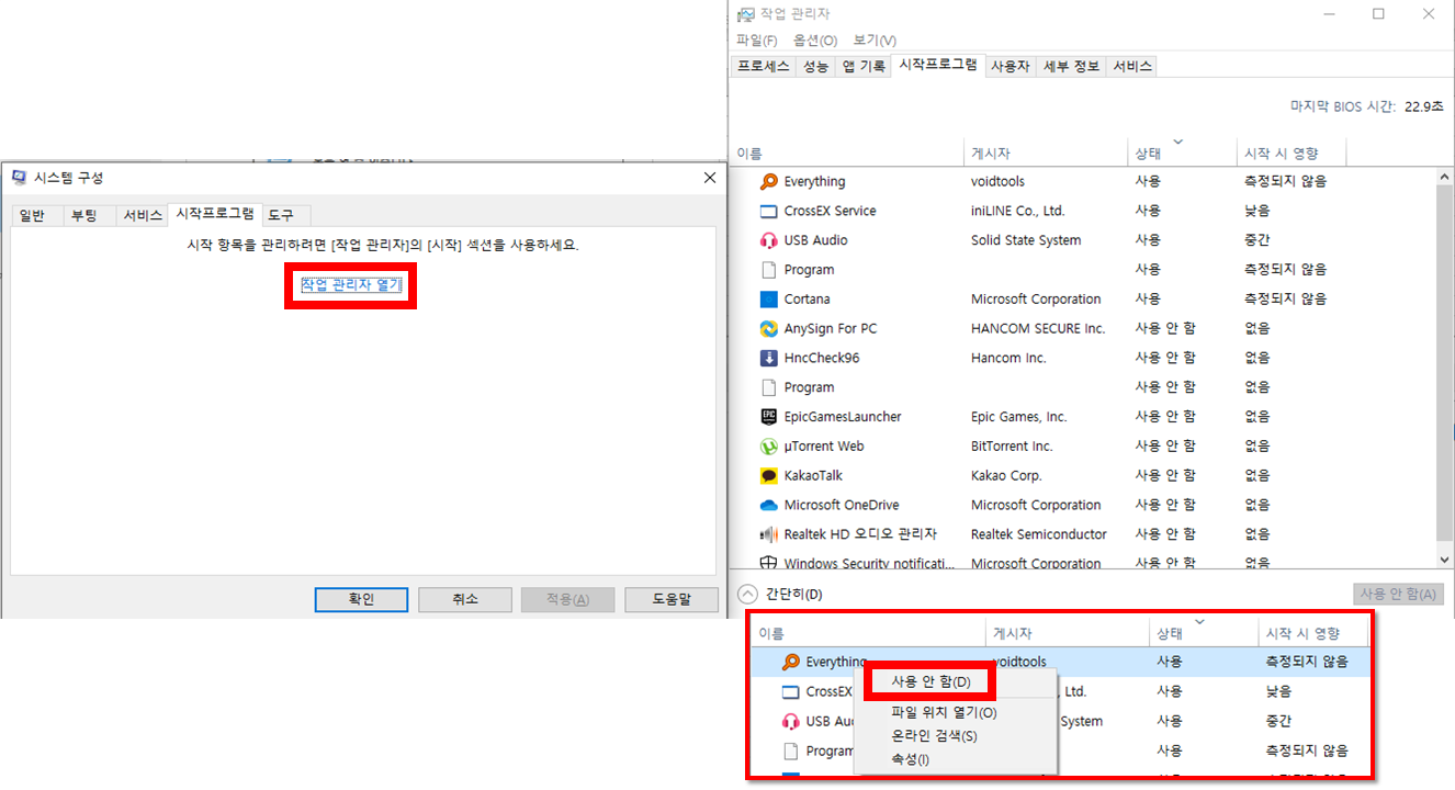 작업 관리자열기로 열어주면 지금 시작중인 프로그램과 사용안함으로된 프로그램이 있는데요.