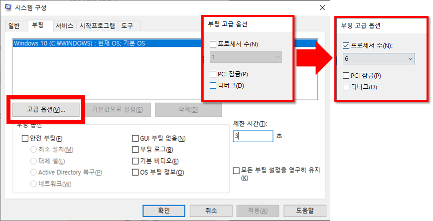 자 이번에는 고급 옵션에 들어가면 프로세서 수라는 옵션이 있는데요.