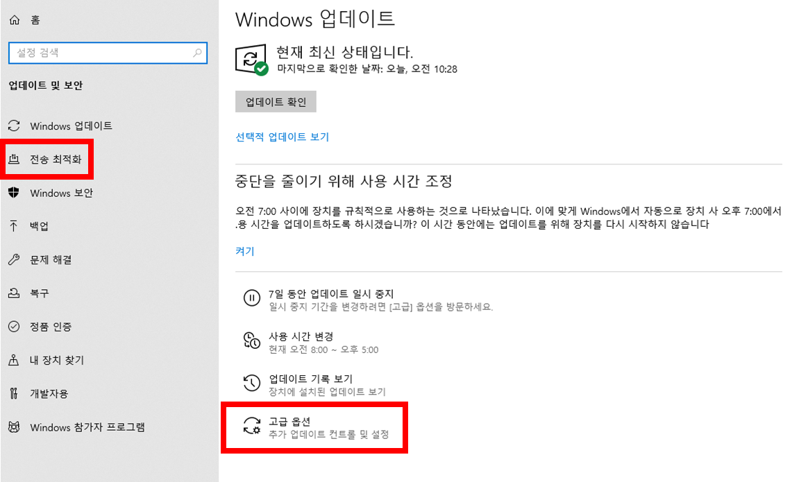 - Windows 업데이트 → 고급 옵션 → 업데이트 옵션 → 전부 끄기