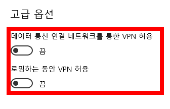 - 데이터 통신 연결 네트워크를 통한 VPN 허용 → 끔