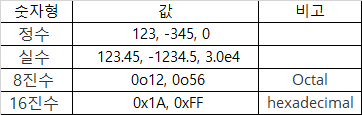 숫자형이란 말 그대로 숫자 형태로 이루어진 자료형으로 정수, 실수, 진수(2진수,8진수,16진수)등이 포함된다.