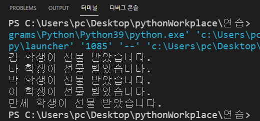 거기서 이제 '~학생이 선물을 받았습니다' 라고 출력해준뒤 체크에 1을 더해서 받은 명수를 확인합니다.