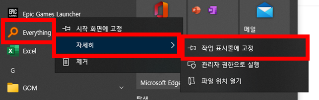자세히 안에 보면 작업표시줄에 고정 메뉴가 있습니다.