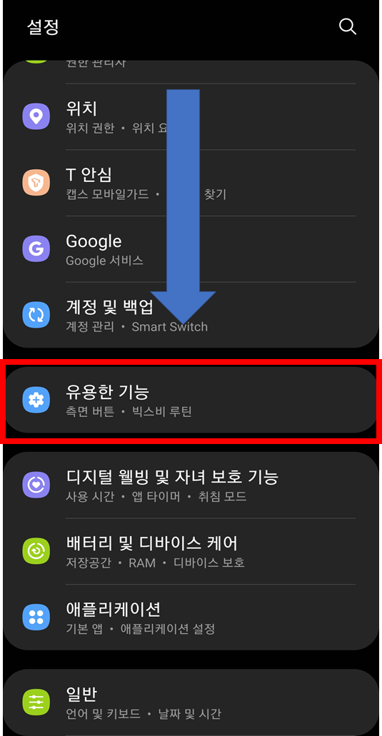 그리고 설정에서 아래로 내리면 유용한 기능 버튼이 나오는데 눌러줍니다.