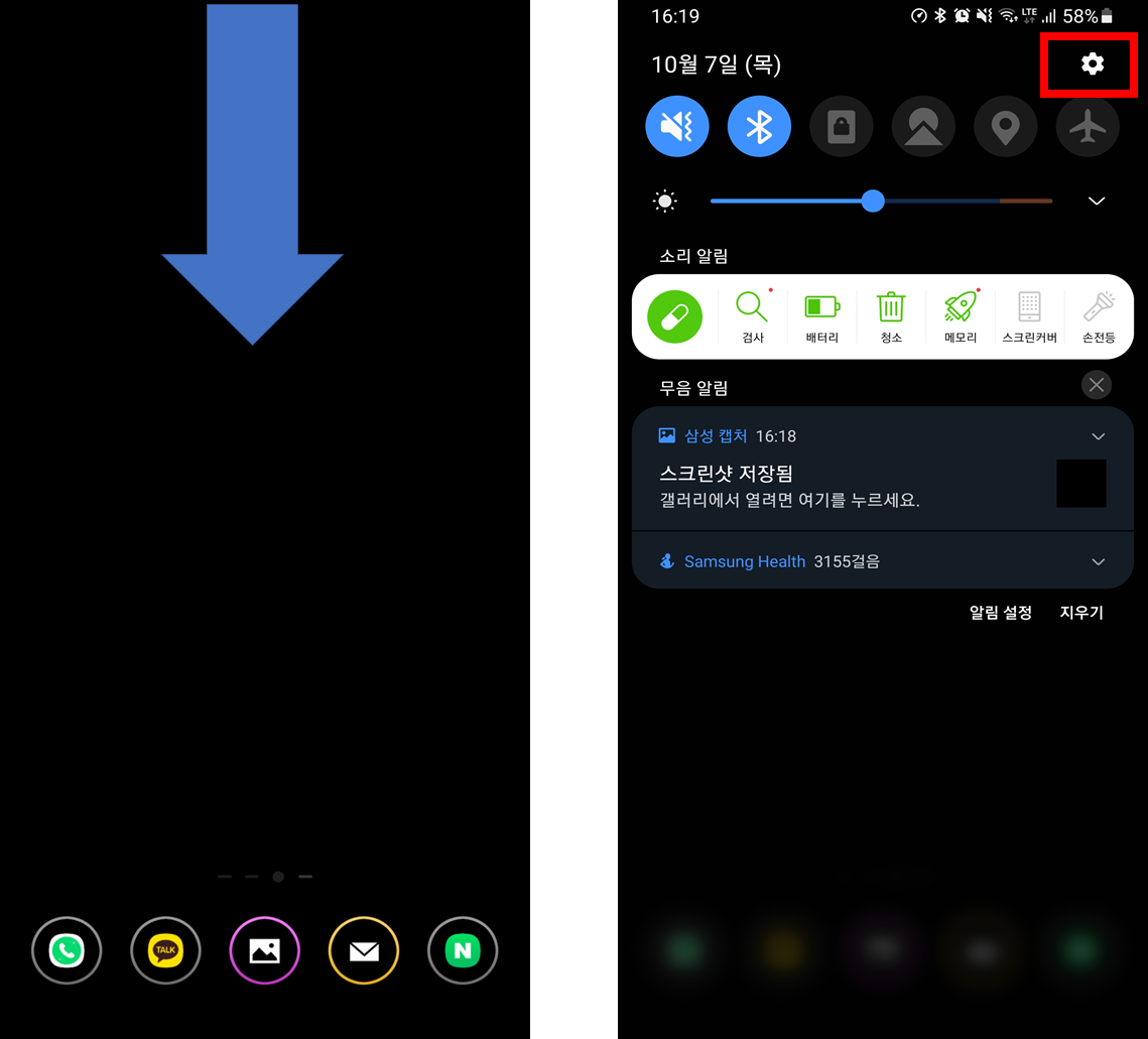 먼저 홈 화면에서 아래로 쓸어내려서 우측 상단의 톱니바퀴모양의 설정버튼을 눌러줍니다.