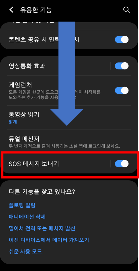 유용한 기능에서 아래로 내리면 'SOS 메세지 보내기'가 있습니다.