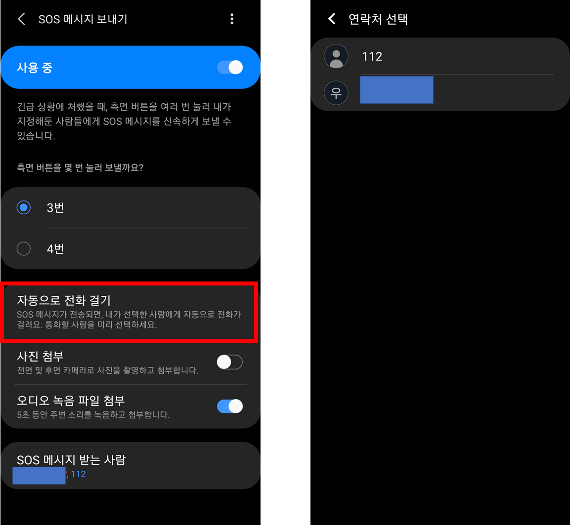 일단 측면 버튼을 설정한 뒤 자동으로 전화걸기에 들어가면 우측과 같이 연락처를 선택할 수 있습니다.