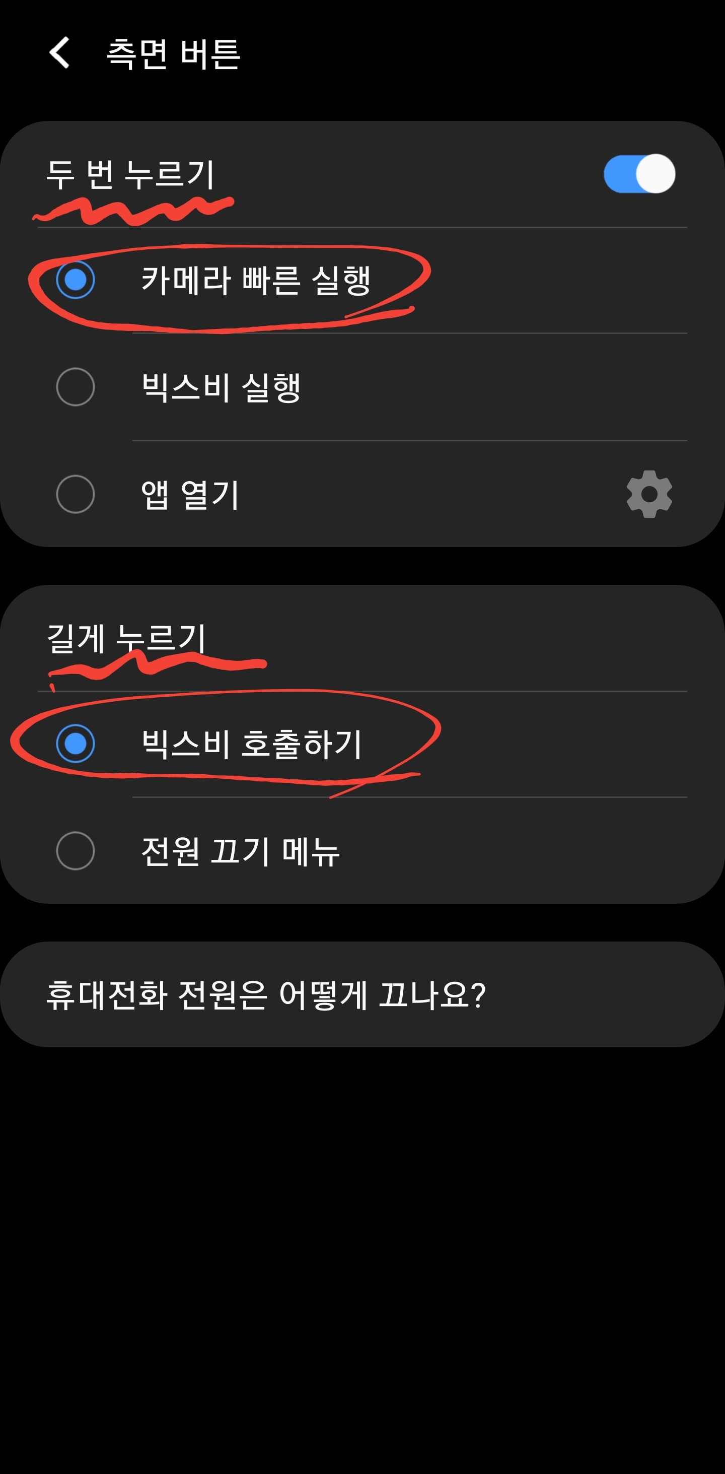 저는 두번 누르기는 카메라로 길게 누르기는 빅스비호출로 사용하고 있습니다.