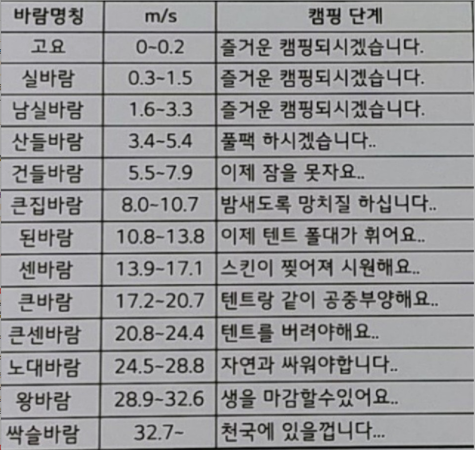 솔직히 저는 저 정도는 아니고 10m/s 이하 정도를 편안한 캠핑의 기준으로 잡고