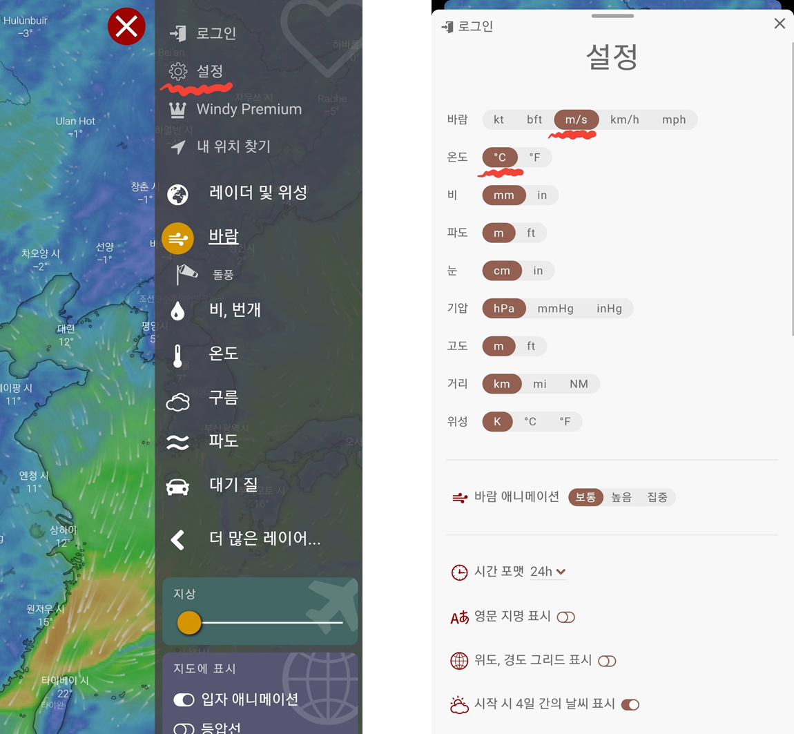 설정에 보면 바람단위를 kt → m/s로 바꿔주고 온도도 화씨에서 섭씨로 변경해주세요!