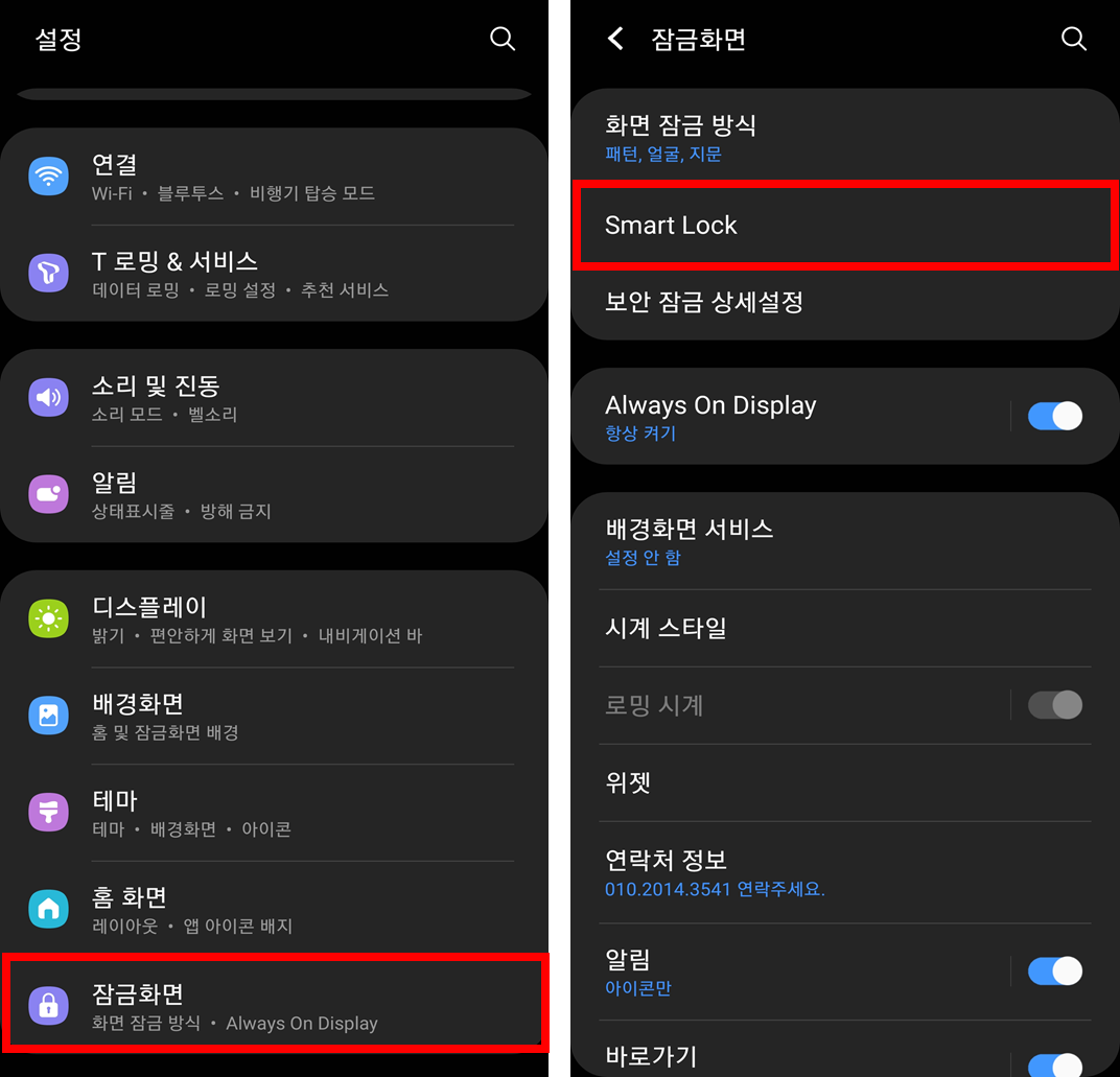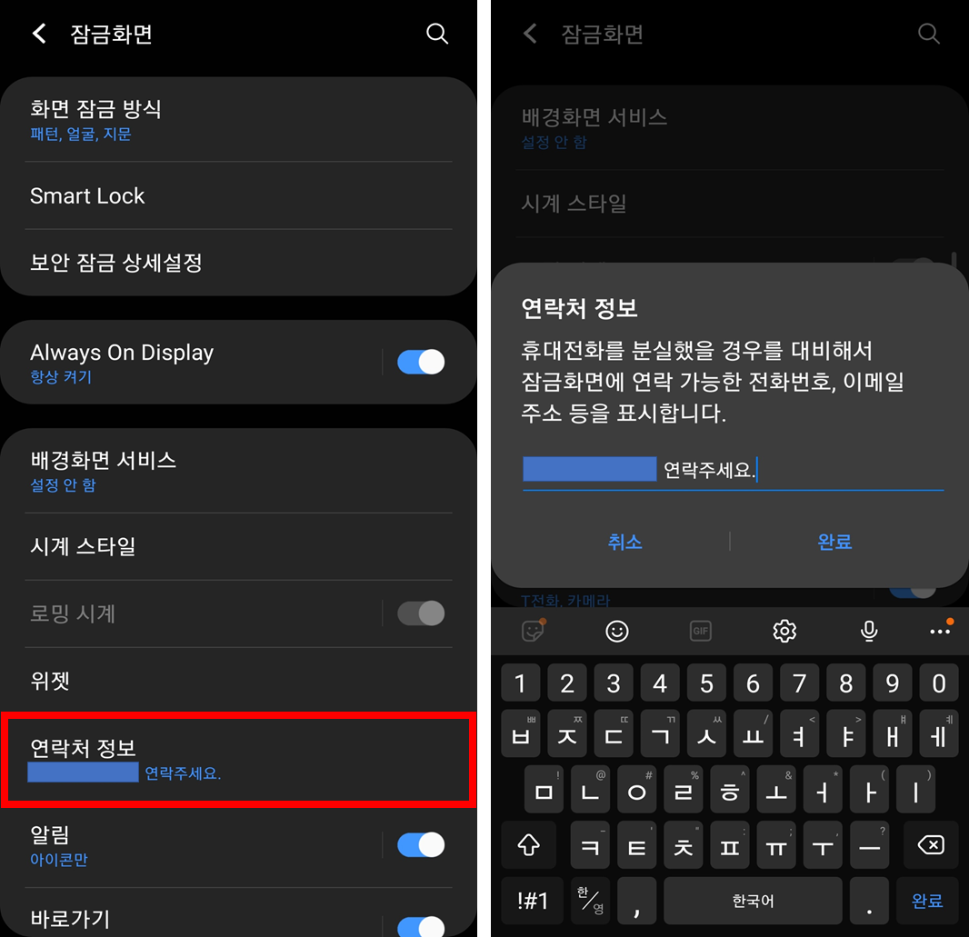 잠금화면에 연락처정보를 설정해놓으면 잠금화면에 표시됩니다.