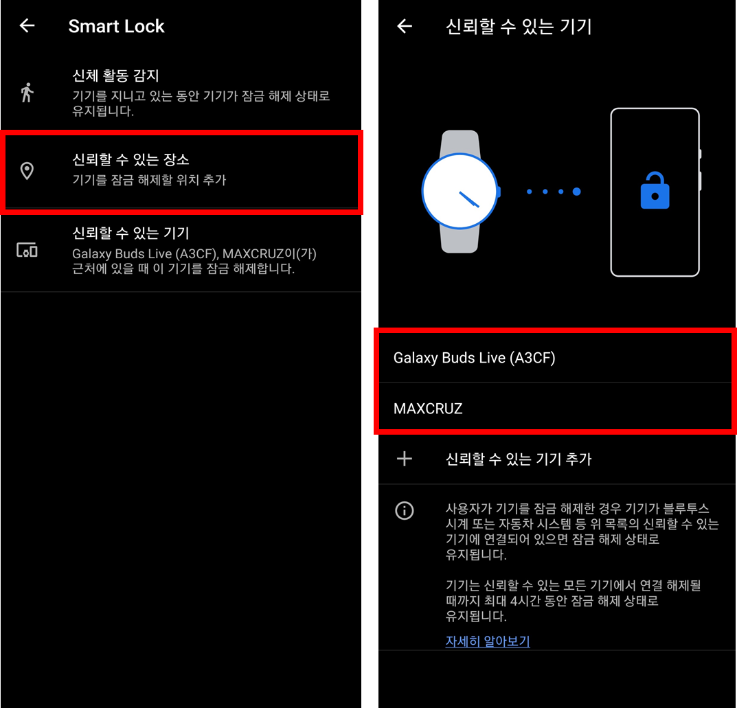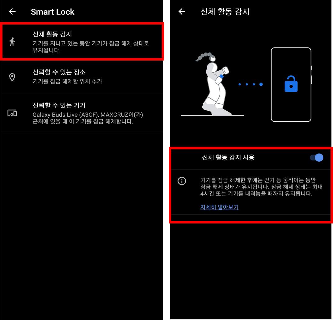 신체 활동 감지, 신뢰할 수 있는 장소, 신뢰할 수 있는 기기가 있습니다.