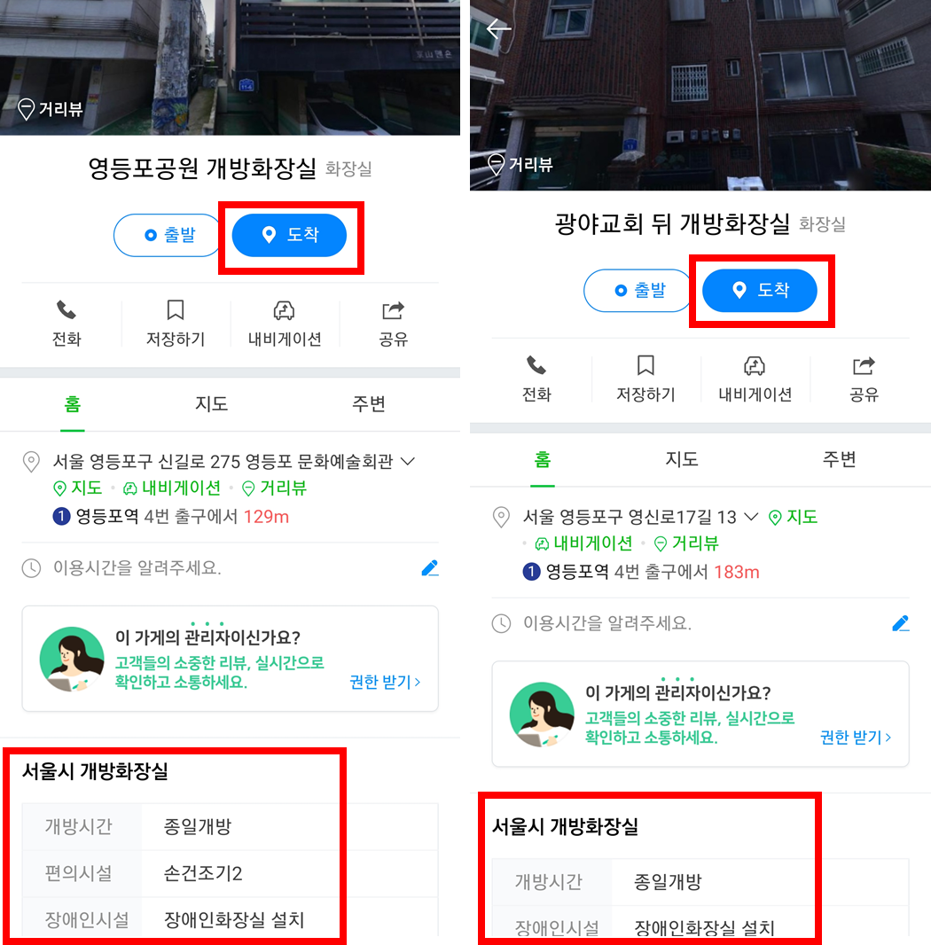 제일 중요한 개방시간과 네비를 찍을 수 있는 출발/도착버튼까지!