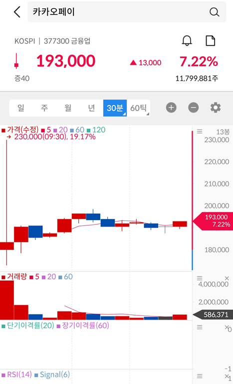 그럼 카카오페이 금일 차트 한번 볼까요?